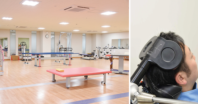●リハビリテーション室(左) ●TMS治療(右)/ 磁気刺激で脳卒中後の後遺障害に対し、脳機能代謝能力を高める治療