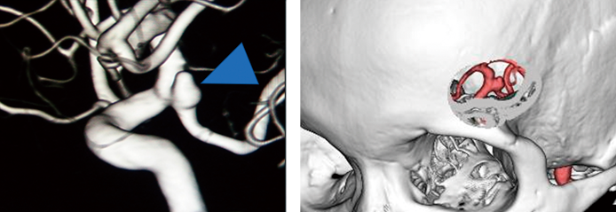 ●鍵穴手術による未破裂動脈瘤のクリッピング術 / CTアンギオグラフィーや3D-CTA(3次元CT血管造影)などを用いて動脈瘤の位置や形状を把握し、それをもとに患者さんそれぞれに最適かつ最小の切開で手術が可能になるよう、シミュレーションを行い、顕微鏡下でクリッピング手術を行います。(青い矢印の部分が動脈瘤)
